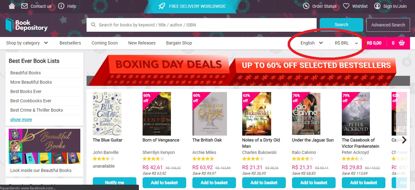 O site é todo em Inglês então é essencial que entenda o idioma mas também tem a opção para deixar o site todo em Espanhol, a vantagem da Book Depository é que podemos escolher em que moeda o valor dos livros aparece e por enviar ao Brasil têm a opção R$ BRL que mostra todos os preços em Real.