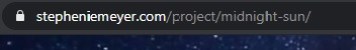 Voltando para a notícia, quando abrimos o site da autora stepheniemeyer.com aparece a contagem regressiva e um link para continuar, onde aparece o conteúdo restante do site normal. Mas… o rascunho que a autora postou desapareceu e quando você pesquisa no Google ‘Stephenie Meyer Midnight Sun drafts’ (que traduz para Sol da meia noite rascunhos) não aparece o rascunho e sim você é redirecionado para o site com a contagem regressiva mas com o endereço diferente sendo esse stepheniemeyer.com/project/midnight-sun/.