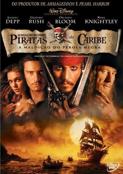 Sinopse: O excêntrico capitão Jack Sparrow pretende salvar a bela Elizabeth, filha do governador, e seu navio, o Pérola Negra, levados pelo temido capitão Barbossa. Ele desbrava os mares e parte em direção à misteriosa Ilha da Morte, tentando impedir que os piratas-esqueleto derramem o sangue de Elizabeth para desfazer a maldição que os assola.