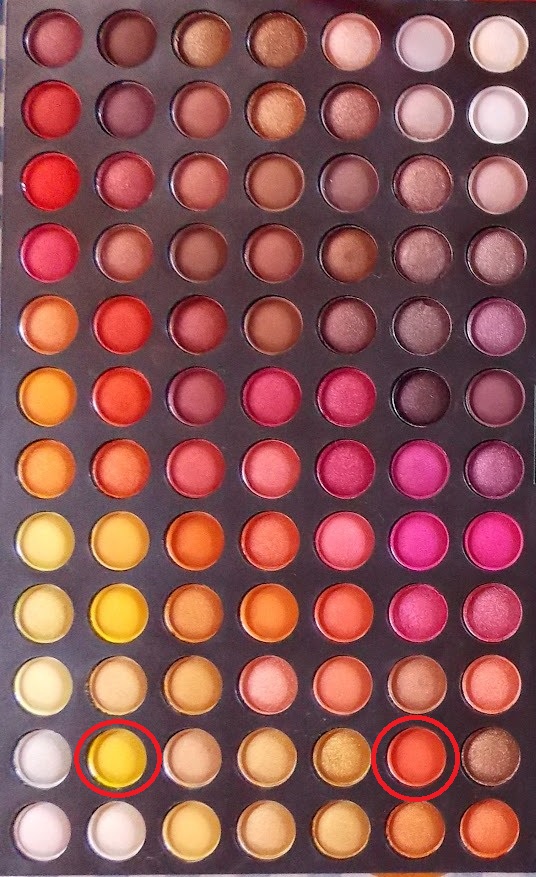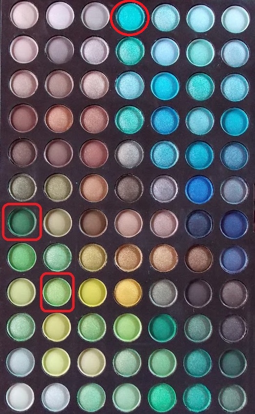 2. Usando minha paleta de 252 cores, ache o Turquesa mais brilhante e aplique no canto interno da pálpebra e um pouquinho abaixo da linha d’água inferior. (fotos com as cores da paleta que usei circuladas de vermelho)